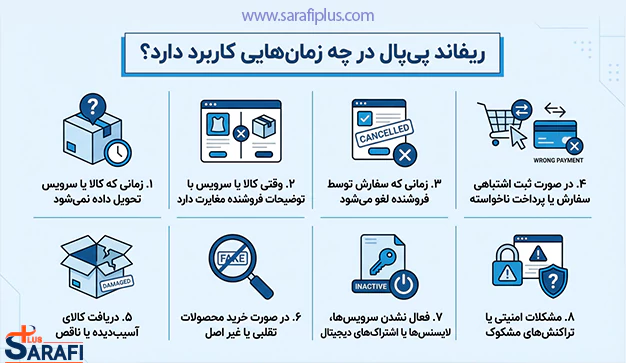 | ریفاند پیپال در چه زمانهایی کاربرد دارد؟ | زمانی که خرید دچار مشکل شود؛ مثل عدم تحویل کالا، مغایرت محصول، خطای پرداخت یا مشکلات امنیتی. |